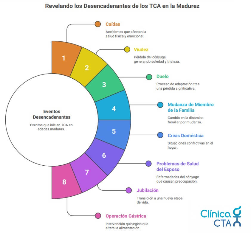 Pueden ser muy diferentes los eventos que desencadenen un TCA, entre ellos: caídas, viudez, duelo, mudanza de miembro de la familia, crisis doméstica, problemas de salud del esposo, jubilación, operación gástrica, insatisfacción marital, estrés en la crianza de los hijos, cambio de residencia.